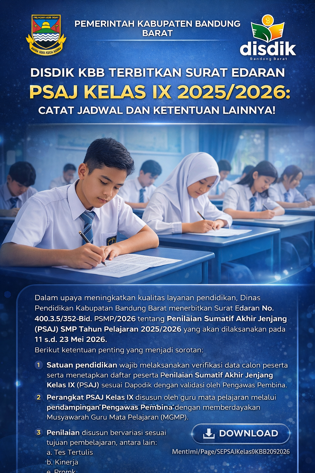 Bandung Barat – Dalam upaya meningkatkan kualitas layanan pendidikan di Kabupaten Bandung Barat (KBB), Dinas Pendidikan Kabupaten Bandung Barat (Disdik KBB) menerbitkan Surat Edaran (SE) Nomor 400.3.5/352-Bid. PSMP/2026 tentang Pelaksanaan Penilaian Sumatif Akhir Jenjang (PSAJ) SMP Tahun Pelajaran 2025/2026.