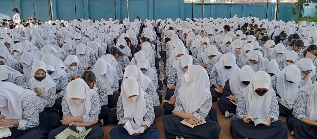 Seluruh guru, seluruh murid, dan kepala sekolah bersamaan membaca buku. Buku yang dibaca juga bervariatif, ada novel, cerpen, ada juga yang membaca buku kumpulan puisi.