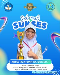 Adapun prestasi tersebut diraih oleh Adifa Izzatunnisa Qosimah sebagai Juara 1 Putri Maca/Nulis Aksara Sunda dan Muhamad Azka sebagai Juara 1 Putra Maca/Nulis Aksara Sunda. Keberhasilan ini menjadi kebanggaan tersendiri bagi keluarga besar SDN Cimanong karena mampu menunjukkan kemampuan terbaiknya di ajang bergengsi tingkat kecamatan.