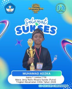 Cililin, KBB – SDN Cimanong meraih prestasi membanggakan pada ajang Festival Tunas Bahasa Ibu (FTBI) tingkat Kecamatan Cililin tahun 2026. Pada kegiatan lomba minat dan bakat siswa jenjang SD yang diselenggarakan di SDN Liasembada Cililin tersebut, dua peserta didik SDN Cimanong berhasil meraih Juara 1 pada cabang Maca/Nulis Aksara Sunda.